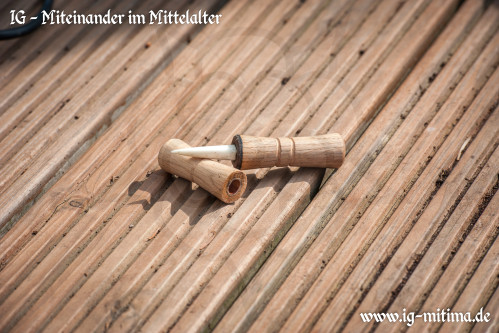 Herausgekommen ist ein, in ein Stück rund geschnitztes Eichenholz eingelassener, Dorn aus Rinderknochen. Damit ich nicht selbst unbeabsichtigt Opfer des Dorns werde, bekam dieser noch eine Kappe, die ebenfalls aus einem rund geschnitzten Stück Eicheholz besteht.
